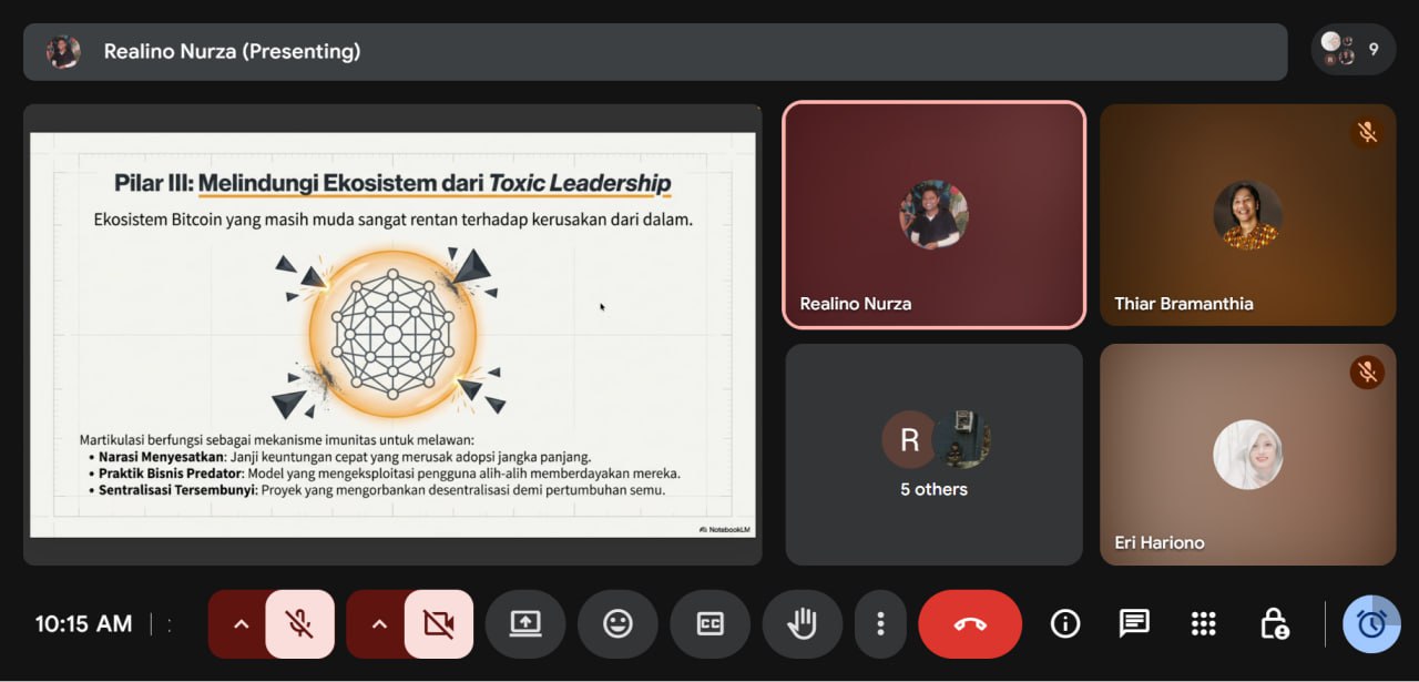 Salah satu pesan paling kuat dalam pertemuan ini adalah kesadaran bahwa kepemimpinan di dunia Bitcoin tidak bisa disamakan dengan kepemimpinan bisnis konvensional. Bitcoin bukan hanya produk atau instrumen, melainkan sebuah ekosistem nilai. Ketika kepemimpinan gagal memahami hal ini, yang muncul adalah toxic leadership: janji keuntungan cepat yang menggerus kepercayaan, praktik bisnis predator yang mengeksploitasi pengguna, serta sentralisasi terselubung yang dibungkus dengan jargon desentralisasi. Kick off meeting ini secara tegas memposisikan diri sebagai antitesis dari pola tersebut.
